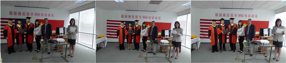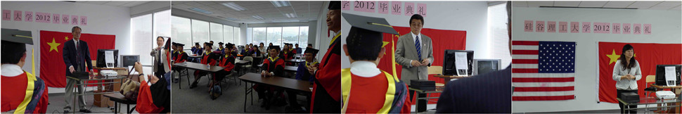 图1:安院长主持毕业典礼;图2:毕业典礼场景;图3:美国教育基金会会长;图4:Cupertion 市长讲话
