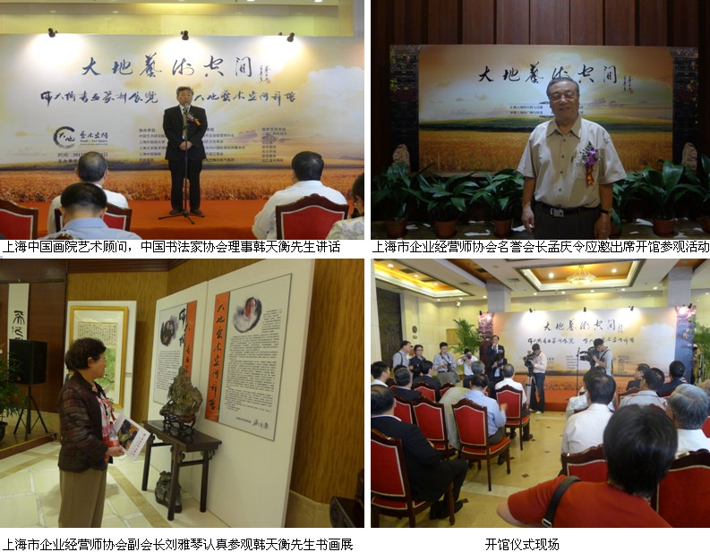 2012年10月10日下午3点18分,由著名画家何百明等筹划数年,由全国人大人大常委会龚学平题词的 “大地艺术空间”正式开馆,此次由著名艺术大师韩天衡首次举办的艺术展览。协办单位有:中国篆刻艺术学院、上海外国语大学、上海大学美术学院等;支持单位有:上海市企业经营师协会、虹口区文化商会、上海市浙江商会等。媒体支持单位有:上海广播电视台、解放日报、文汇报、新民晚报等。上海市企业经营师协会作为承办单位应邀出席开馆仪式,中共上海市委常委、宣传部部长杨振武出席并为开馆剪裁,出席开馆市各方面的领导和老领导等,上海市企业经营师协会名誉会长孟庆令、会长蔡淳华、副会长刘雅琴及协会部分理事秦燕、谭强伟等一同参加开馆活动。