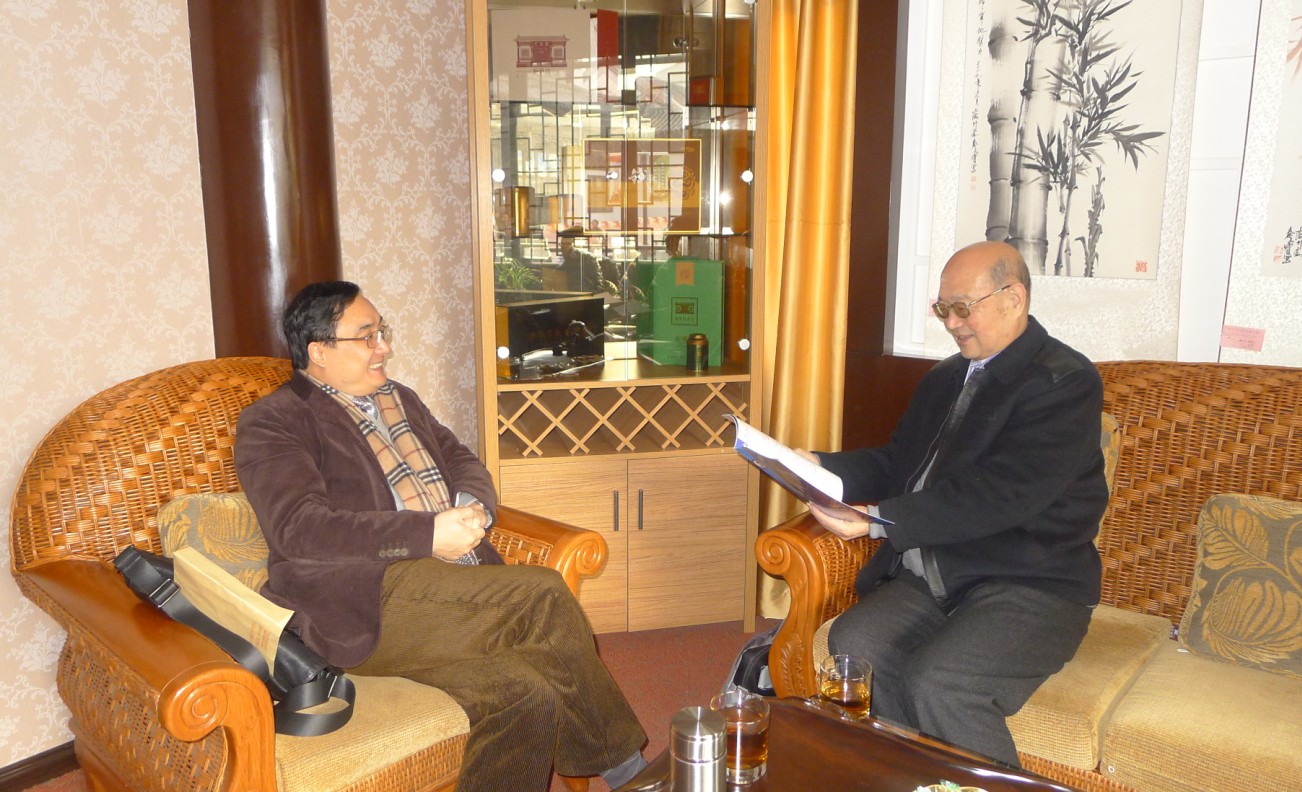 上海市企业经营师协会会长蔡淳华向协会名誉会长、全国政协委员,著名的社会学家邓伟志汇报协会一年来工作
