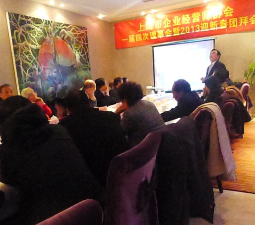 上海市企业经营师协会一届四次理事会暨迎新春团拜会于2013年1月13日下午14:00假虹井路888弄19号公馆隆重举行。参加会议的领导有:原上海市总工会主席、现上海市企业经营师协会高级专家顾问江荣;上海市企业经营师协会名誉会长、全国政协常委、著名的社会学家邓伟志;上海市企业经营师协会副会长、原上海市科技党委书记、科委主任、市人大常委内务司法委主任朱寄萍;原中共上海市委委员、上海市工业党委书记、现上海市企业经营师协会名誉会长孟庆令;原上海市长宁区人大常委会主任、现中共上海市长宁区委决策咨询委员会主任、上海市企业经营师协会副会长刘雅琴等一批德高望重的领导及协会理事们。会议由上海市企业经营师协会副会长、上海港口协会副会长、原中共上海市杨浦区区委书记张国强主持。