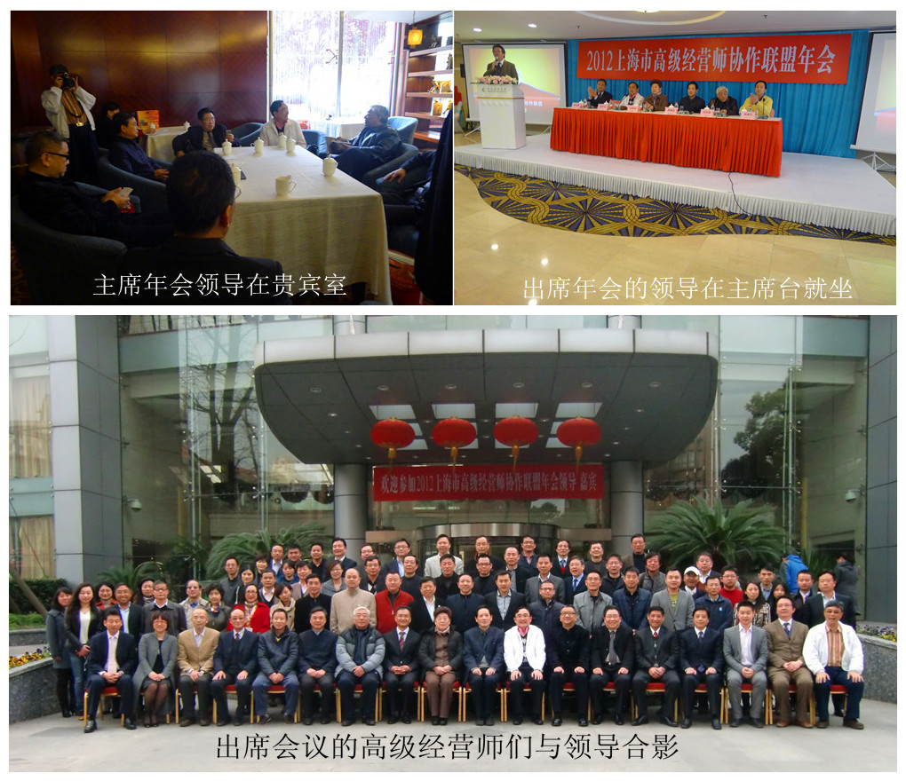 2013年3月10日(星期日)下午14:00在上海新凤城宾馆一楼欧洲厅,上海市高级经营师协作联盟2012年会隆重召开。出席年会的领导:上海市商业联合会副会长兼秘书长刘荣明女士、中国高级经营师评审委员会主任周建国、上海市企业经营师协会会长蔡淳华教授、上海市商业联合会副会长杨浦商业联合会会长刘天祥、上海市高级经营师协作联盟主席邵淳璞、上海市高级经营师协作联盟名誉主席陈建平等100余名高级经营师参加了年会。