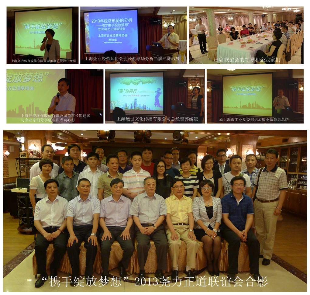 会议由上海尧力体育设施有限公司董事总经理任红琴做开场白,上海师范大学谢晋影视艺术学院播音主持教授高祥荣主持,联谊会首先由蔡淳华会长做当前经济形势报告,然后瞿建国董事长与企业家们分享创业和成功心得,接着郭媛媛总经理介绍了2013年上海羽毛球嘉年华活动主题活动,最后上海企业经营师协会名誉会长孟庆令做总结讲话。联谊会后嘉宾们互相交流并一起享受了正道红酒晚宴。
