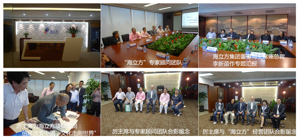 首先,由海立方集团董事局主席兼总裁李新苗作了专题汇报,专家顾问团成员听了汇报和介绍,都表示十分满意和赞赏,厉主席代表专家顾问团作了语重心长的讲话,对海立方项目高度肯定,并嘱托海立方集团经营班子一定要把海立方项目尽快落地。并亲自当场挥笔为海立方项目题词:“创意改变中国,文化走向世界”。会后厉主席兴致勃勃地与专家顾问团队合影留念,并与海立方经营团队合影留念。
