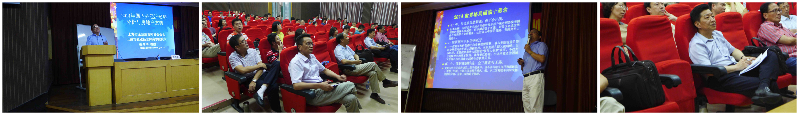 2014年8月14日(周四)下午13:00-16:00,在华阳路112号长宁区现代职校大礼堂,由上海新长宁集团举办全体中层以上干部培训班,学员约120余人。上海新长宁集团特邀上海市企业经营师协会会长、上海市企业经营师商学院院长蔡淳华教授作题为《2014年国内外政治经济形势分析与房地产发展态势》的报告。蔡淳华教授在演讲中引用了大量的数据佐证经济形势状况,并用大量的案例剖析了房地产的态势,赢得了新长宁集团中层以上干部的共鸣。