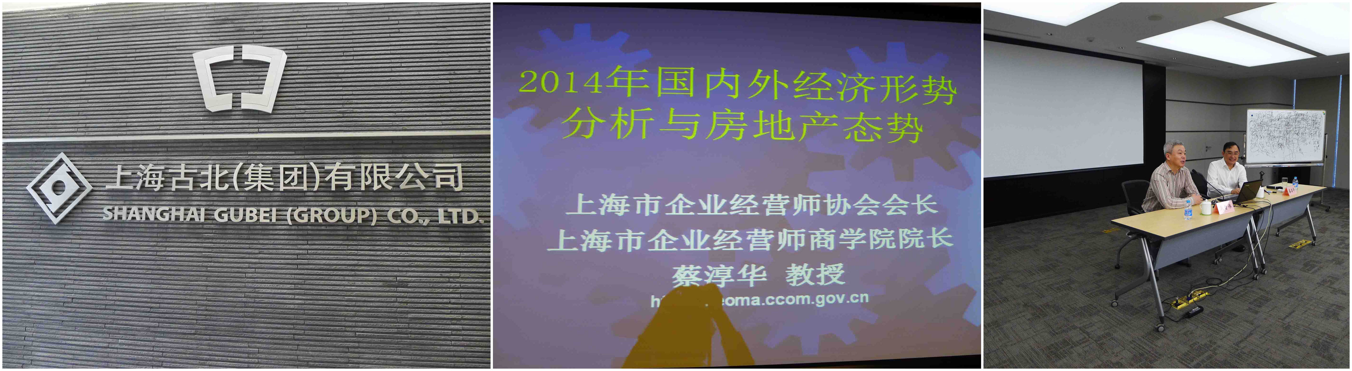 2014年11月7日(周五)下午13:30-16:30,在虹桥路1438号(中华企业大厦)33楼会议室,由上海古北集团举行中层以上100余名干部进行专题培训。培训会议由古北集团党委书记、董事长戴智伟主持,特邀上海市企业经营师协会会长、上海市企业经营师商学院院长蔡淳华教授作题为《2014国内外经济形势分析与房地产发展态势》的演讲。蔡教授演讲后与参加培训的中层干部进行了互动,并一一答疑了大家的提问。