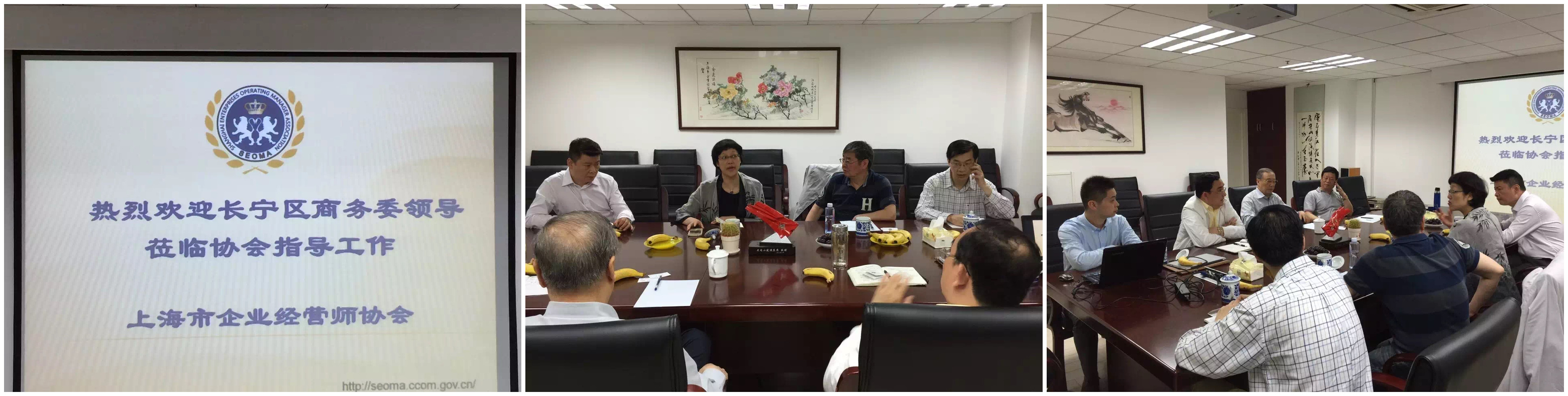 2016年6月8日(周三)上午9:30整,长宁区商务委主任王玮华带领区商业联合会吴同兴会长、区商务委东部功能区招商服务中心任振翔主任、区商务委商业发展科洪亮科长等,前来上海市企业经营师协会现场办公,共商共谋资源整合、资源互补。上海市企业经营师协会智库委员会主任孟庆令、会长蔡淳华、副会长周放、秘书长李建国等参加了会谈。