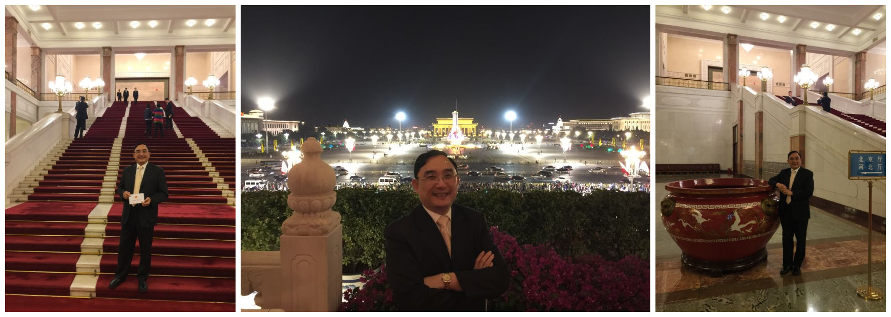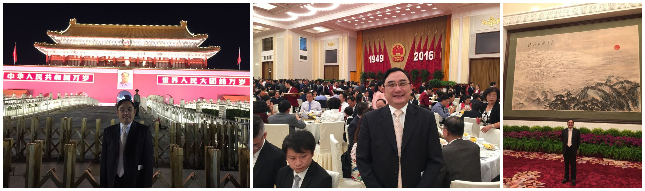 9月30(星期五)晚上六时至七时十五分,在人民大会堂宴会厅举行招待会,上海市企业经营师协会会长蔡淳华有幸应邀与党和国家邻导人及各族人民的代表,共同出席庆祝中华人民共和国成立六十七周年的招待会,出席招待会的党和国家领导人:中共中央总书记习近平;中央政治局常委、全国人大常委会委员长张德江;中央政治局常委、全国政协主席俞正声;中共中央政治局常委刘云山;中央政治局常委、中纪委书记王岐山等,以及各民族代表共1200余名。下午5点开始陆续的入场,18:00正式开始,招待会由中共中央政治局常委、国务院副总理张高丽主持,中共中央政治局常务、国务院总理李克强致词。招待会结束后,蔡淳华会长兴高采烈地登上天安门城楼,观赏雄伟壮丽的天安门广场的夜景,天安门广场灯火辉煌、灿烂夺目,到处呈现出一派生气勃勃、欣欣向荣的景象。时间虽短,但却让蔡淳华会长感到无比美好和难忘,让蔡淳华会长充满着对未来憧憬的梦想!蔡淳华会长暗暗振呼祖国万岁!