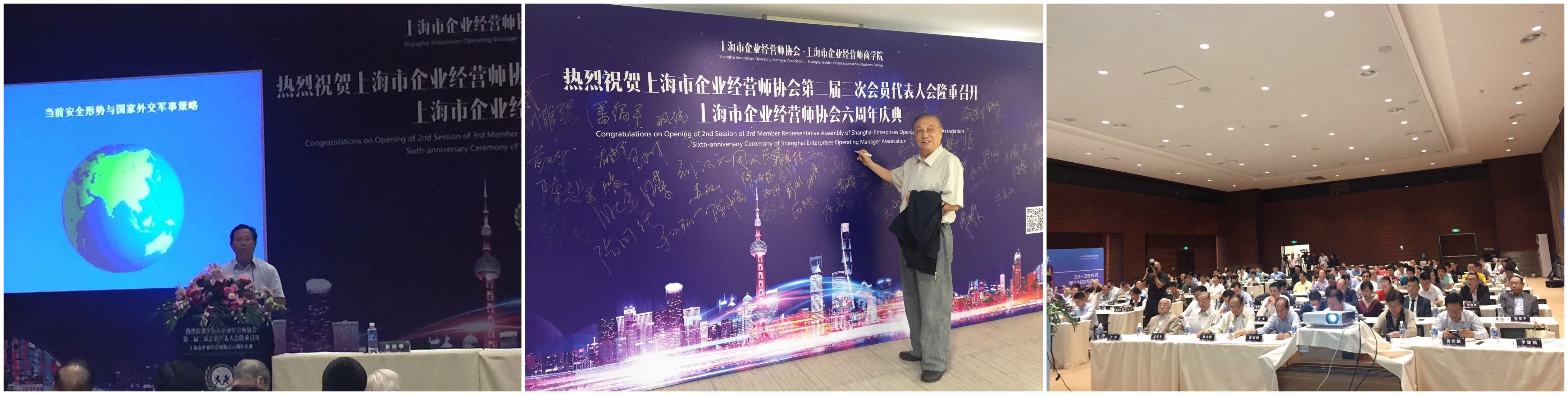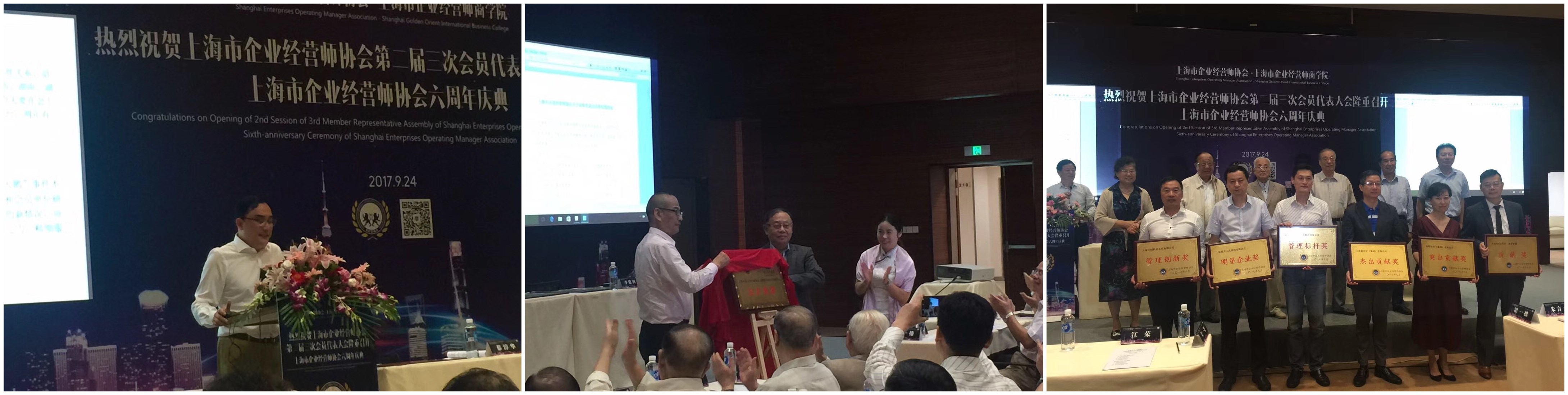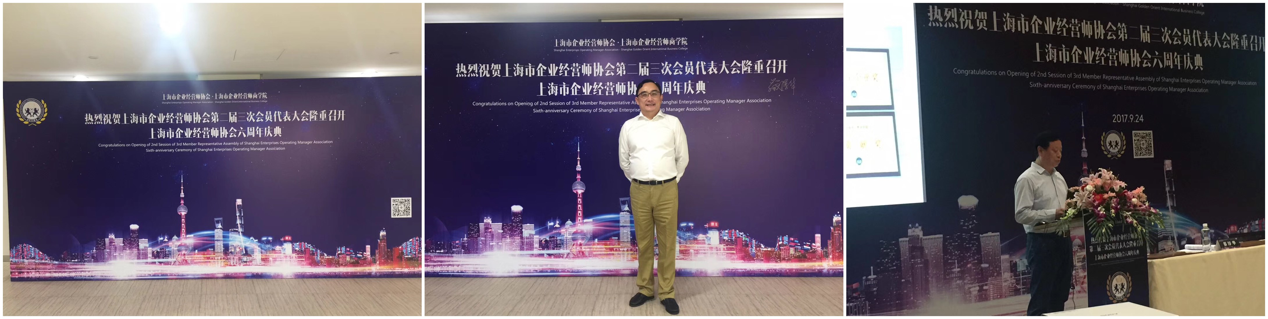 上海市企业经营师协会二届三次会员代表大会暨六周年庆典活动,于2017年9月24日(星期日)下午13:30 - 16:30在国家会展中心(崧泽大道333号A座办公楼3楼A0-02会议室)隆重举行。出席会议的《协会》智库领导:江荣、孟庆令、梅寿椿、张国强、陈安杰、刘雅琴等;长宁区原人大常委会主任朱言文、政协副主席朱辉,以及长宁区委办局领导,还有相关的嘉宾等;《协会》副会长黄经麟、邵淳璞、徐明德、周放、任红琴、毛履安等共有190余人参加。