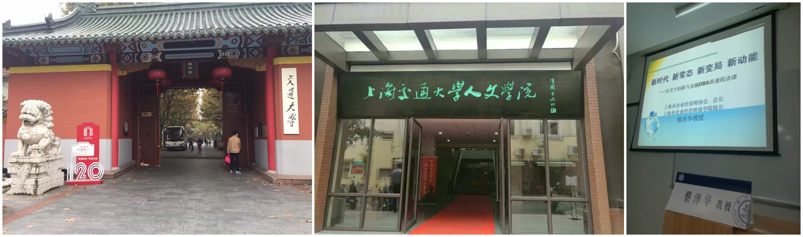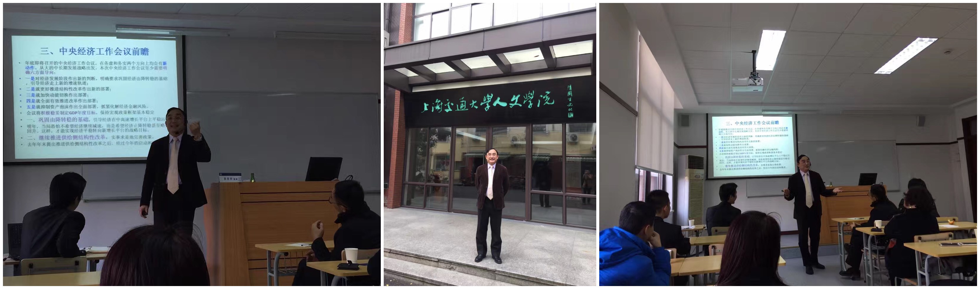 2016年12月10日(星期六)上午9:00 -- 16:30,在交大徐汇校区(华山路1954号)人文学院308教室,由交大《金融创新DBA博士班》的企业家举办《回顾2016年展望2017年》经济预测》讲座,由上海市企业经营师协会会长、上海市企业经营师商学院院长、交大安泰的导师蔡淳华教授作题为《新时代新常态新变局新动能》的演讲。蔡教授讲了六大问题:第一,分析当前全球经济的四大特点;第二,对2016年中国经济的评估;第三,中央经济工作会议前瞻;第四,2017年中国经济预测;第五,经济新常态新变局的新特征。演讲后,蔡教授与企业家们进行交流和互动,解答了企业家们提出的各种疑问,整个课堂里充满着生机和活力。