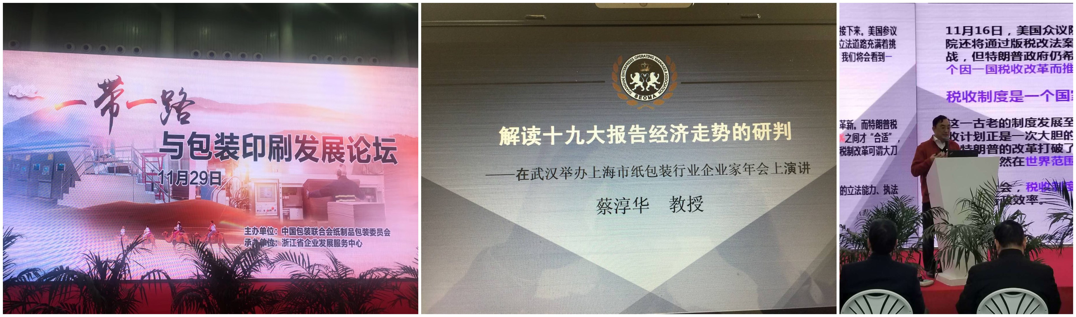 2017年11月29日(星期三)下午15:30 - 17:00,在武汉国际博览中心,中国包联纸委业展览会论坛会上,参与此论坛会的共有100余人企业家出席。特邀上海市企业经营师协会会长、上海市企业经营师商学院院长蔡淳华教授作题为《全面解读党的十九大报告,研判经济走势》的主旨演讲,蔡教授用通俗易懂的语言解读了十九大报告中的新提法、新举措,同时分析了国内外经济的走势。与会人员非常受启发,纷纷表示报告很接地气。主旨演讲结束后,蔡教授回答了企业家们提出的各种问题。整个论坛会开得非常圆满。
