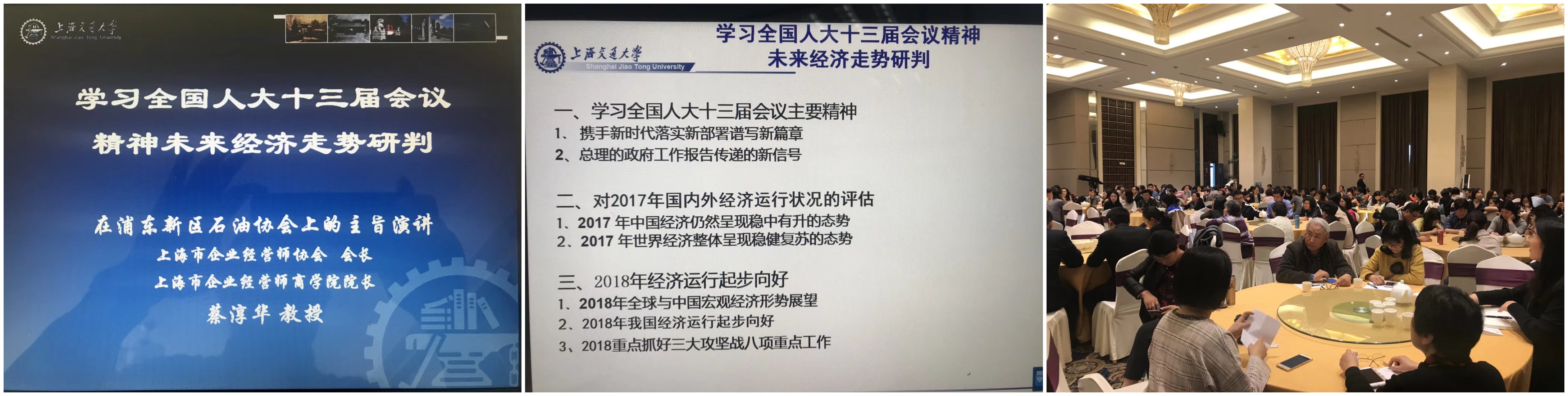 上海市浦东新区石油制品行业协会会长特邀上海市企业经营师协会会长、上海市企业经营师商学院院长蔡淳华教授作题为《解读全国人大十三届会议精神,未来经济走势研判》的主题演讲。蔡教授一个半小时的精彩演讲,与会人员认真静心的听讲,并且互动交流,与会人员都感到报告精彩、内容充实、案例生动,纷纷表示听完演讲深受启发和帮助。