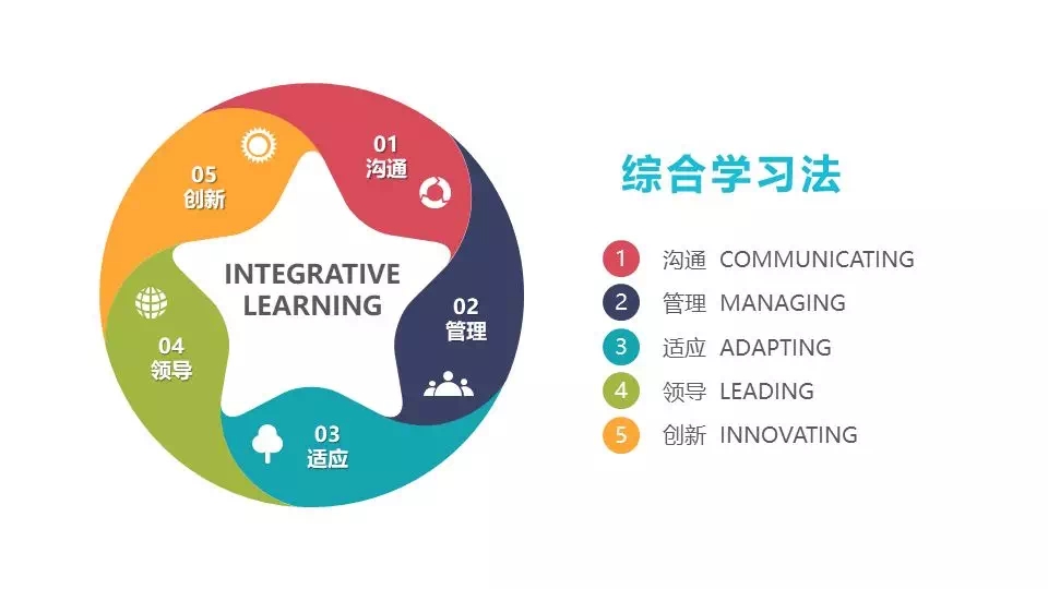 课程以综合学习法为主要培养方式,即通过沟通、管理、适应、领导和创新五步骤来实现最终学习目的和成果。